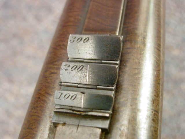stationery sight likely for 50 yards; blued steel blade front sight dovetailed at muzzle.