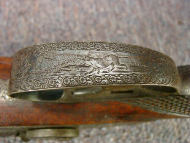 panel scenes on lockplates of pheasant on right, grouse on left; pointer flushing pheasant