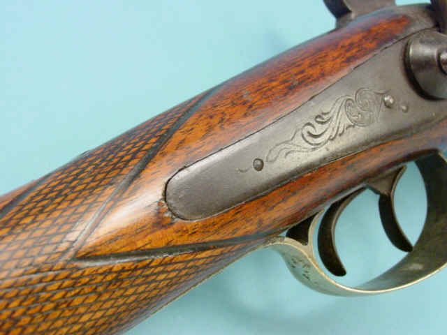 10 gauge, 33 5/8-inch patent breech barrels, lightly engraved back-action locks;
