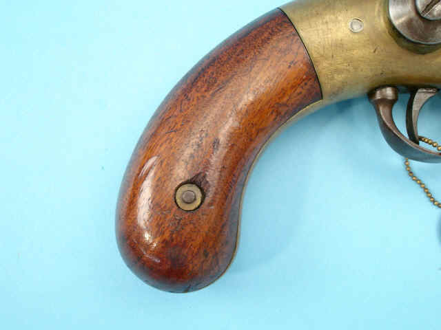 and light surface pitting; mellow patina, nicks, to brass; grips with 95% varnish, nicks