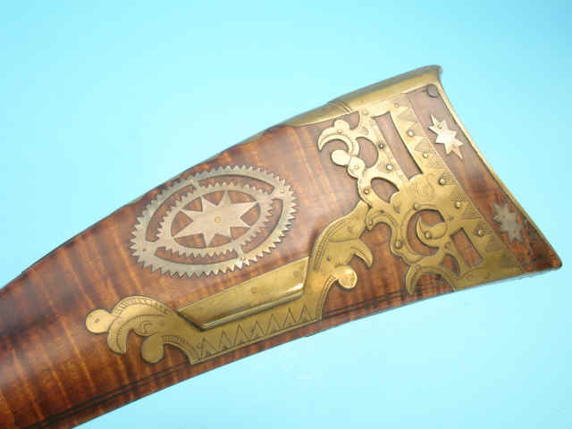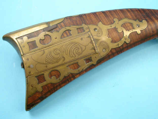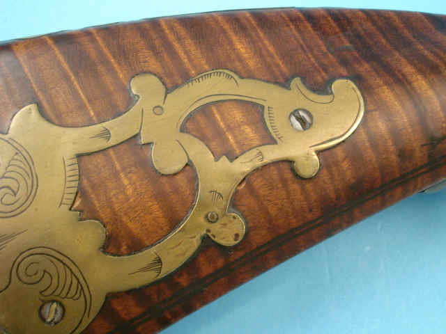 tang. Brass furniture. Ornately engraved scrolled brass patchbox and counterplate. Pierced