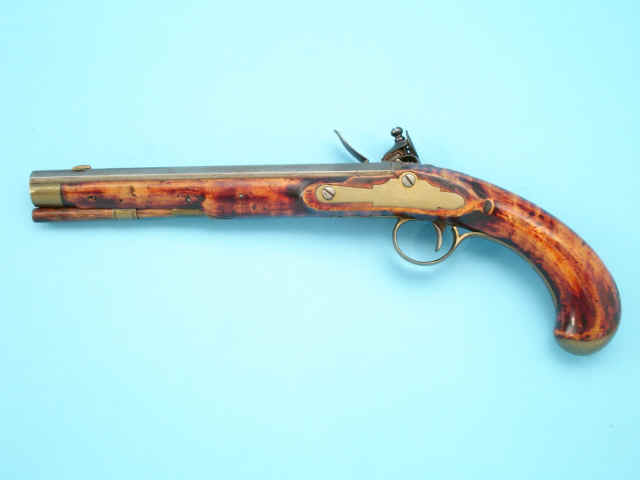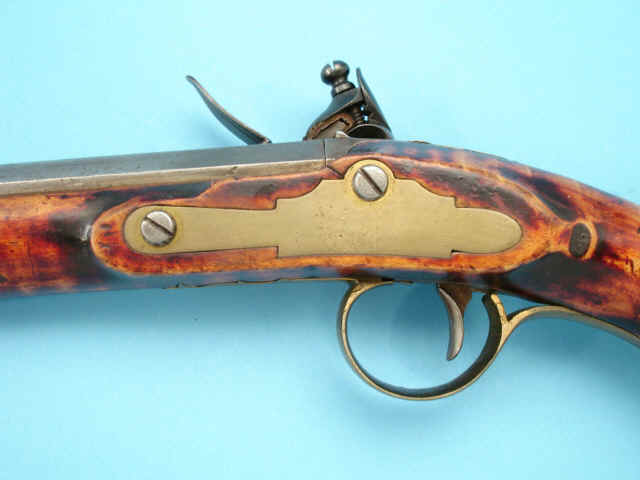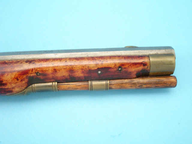 .44 caliber flintlock, 9-inch octagonal smoothbore barrel with brass blade front sight;