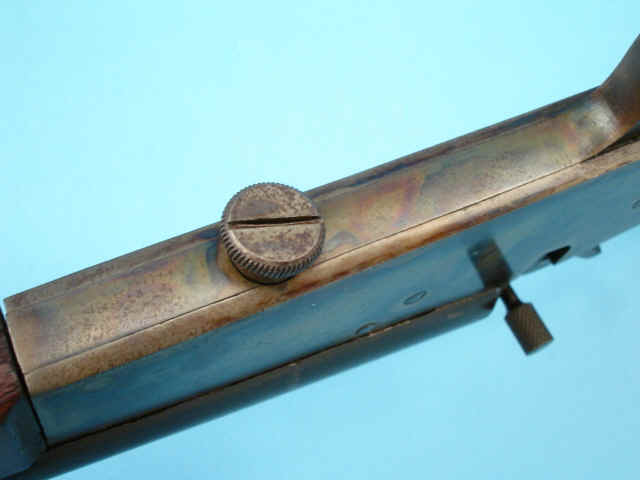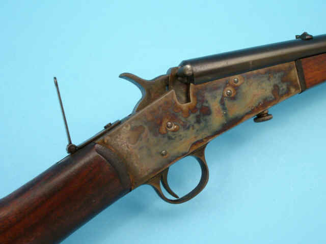 Case-hardened frame. Rolling block action with extractor. Tang-mounted flip-up peep sight.