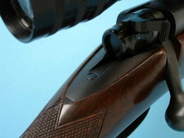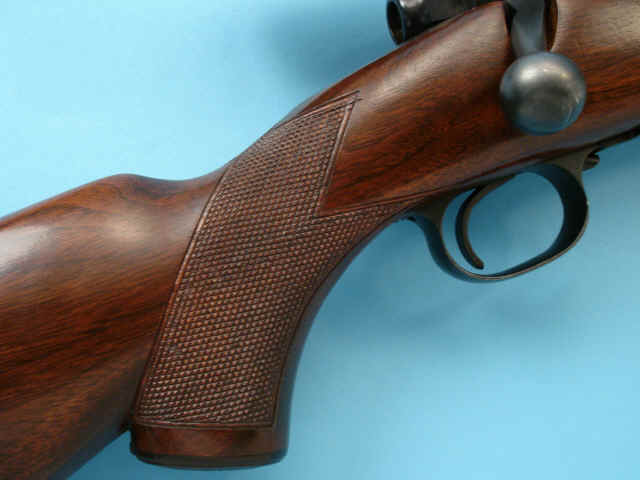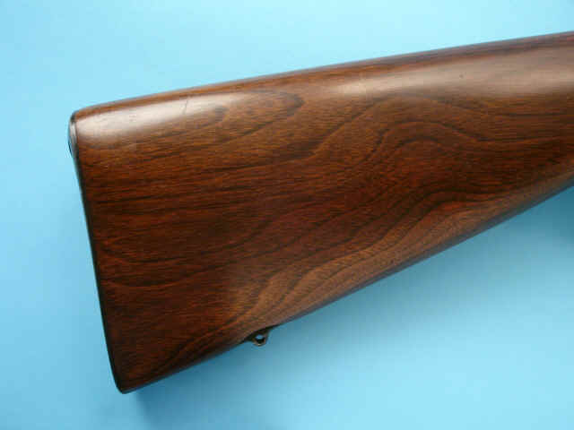 front sight; checkered and varnished pistolgrip stock with checkered steel buttplate and