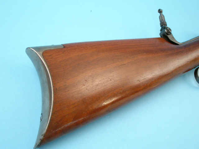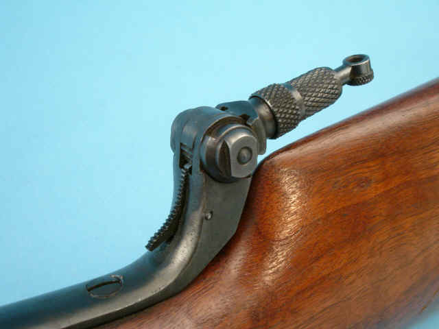full magazine tube; blue finish; walnut stock; rear sight dovetail is filled in, tang