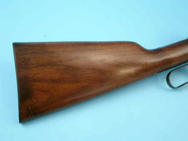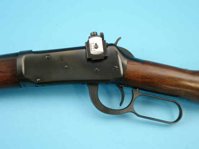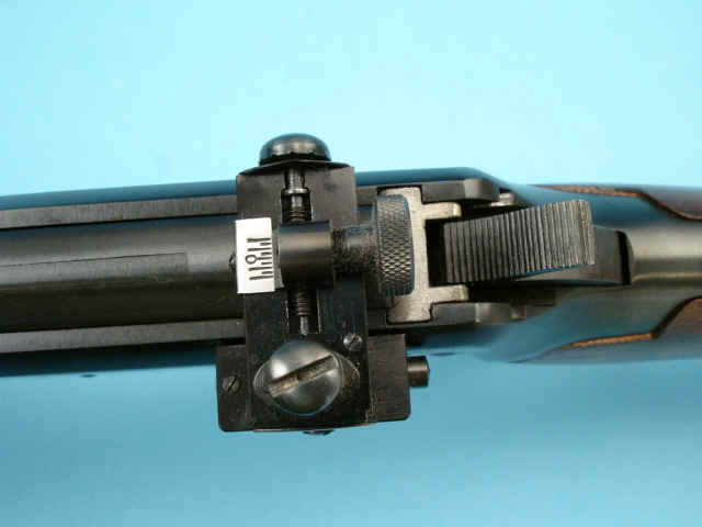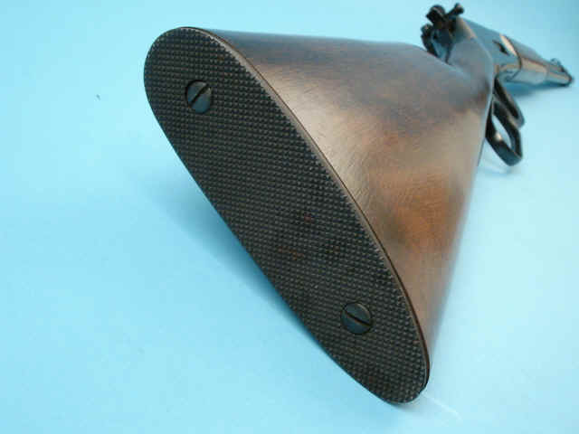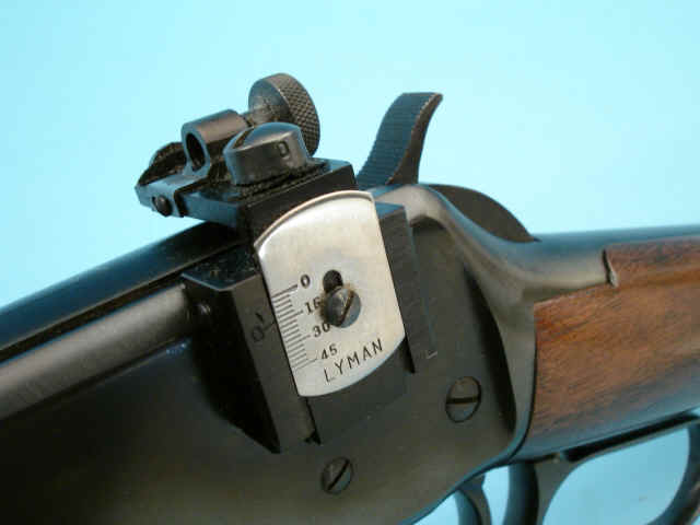stock; lyman rear peep sight, hooded front bead sight, checkered steel butt plate.