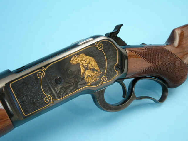 made; blued finish with gold inlayed engraving on the receiver sides, lever, and hammer;