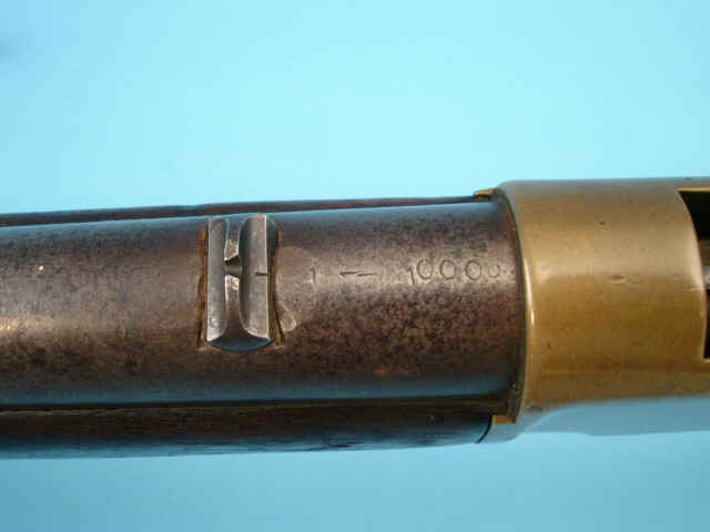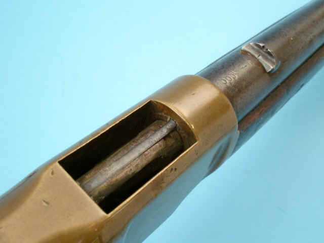 open rear sight. Breech marked: 1-1000. Brass frame. Walnut stocks. Brass buttplate with