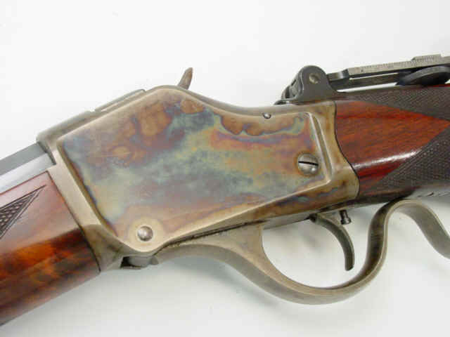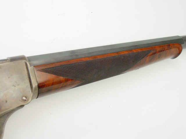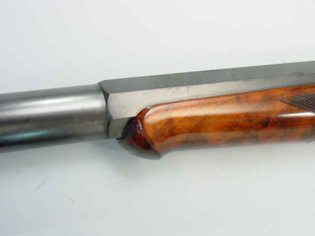 Case-hardened hammer, frame and lever. Adjustable set trigger. Checkered deluxe fore-end