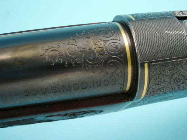 markings, flush gold-inlaid barrel band at breech, accompanied by scroll engraving; open