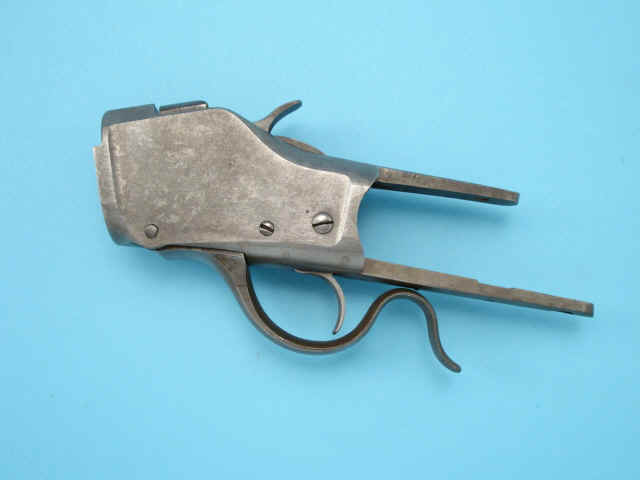 The unmarked grey metal frame with drop-block action. No stock or other parts.